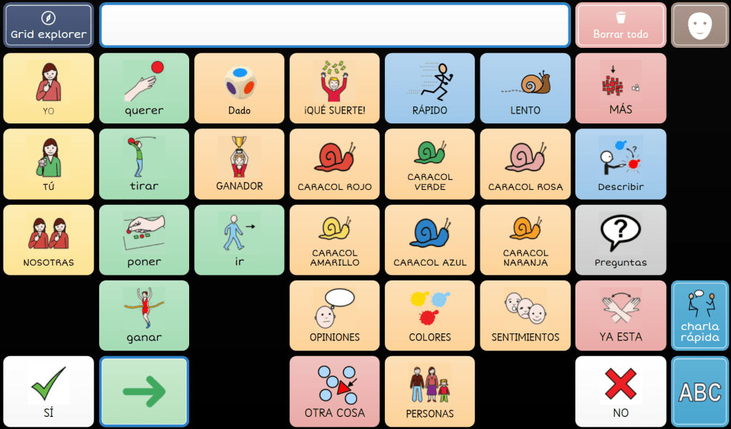 ¡Importante! No hay una única manera de adaptar la cuadrícula del comunicador y siempre es importante respetar la estructura típica del comunicador de usuario concreto, así como el estilo de pictogramas que suele usar. En los Online Grids os dejamos un ejemplo de cuadrícula para el Grid3, nombrada AESR_Snails_Race, que podéis buscar, descargar y usar de modelo, personalizándolo según las necesidades de vuestra hija o hijo e integrándolo en su SAAC.