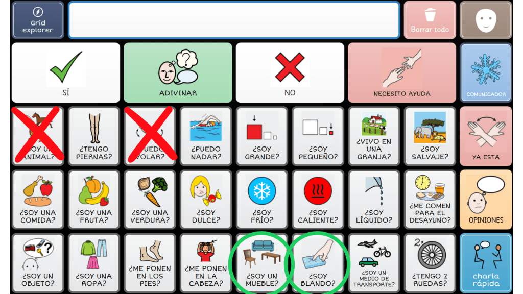 - Una cuadrícula en el dispositivo de comunicación dedicada al juego con palabras necesarias, así como las preguntas que ayuden a desarrollar el juego.